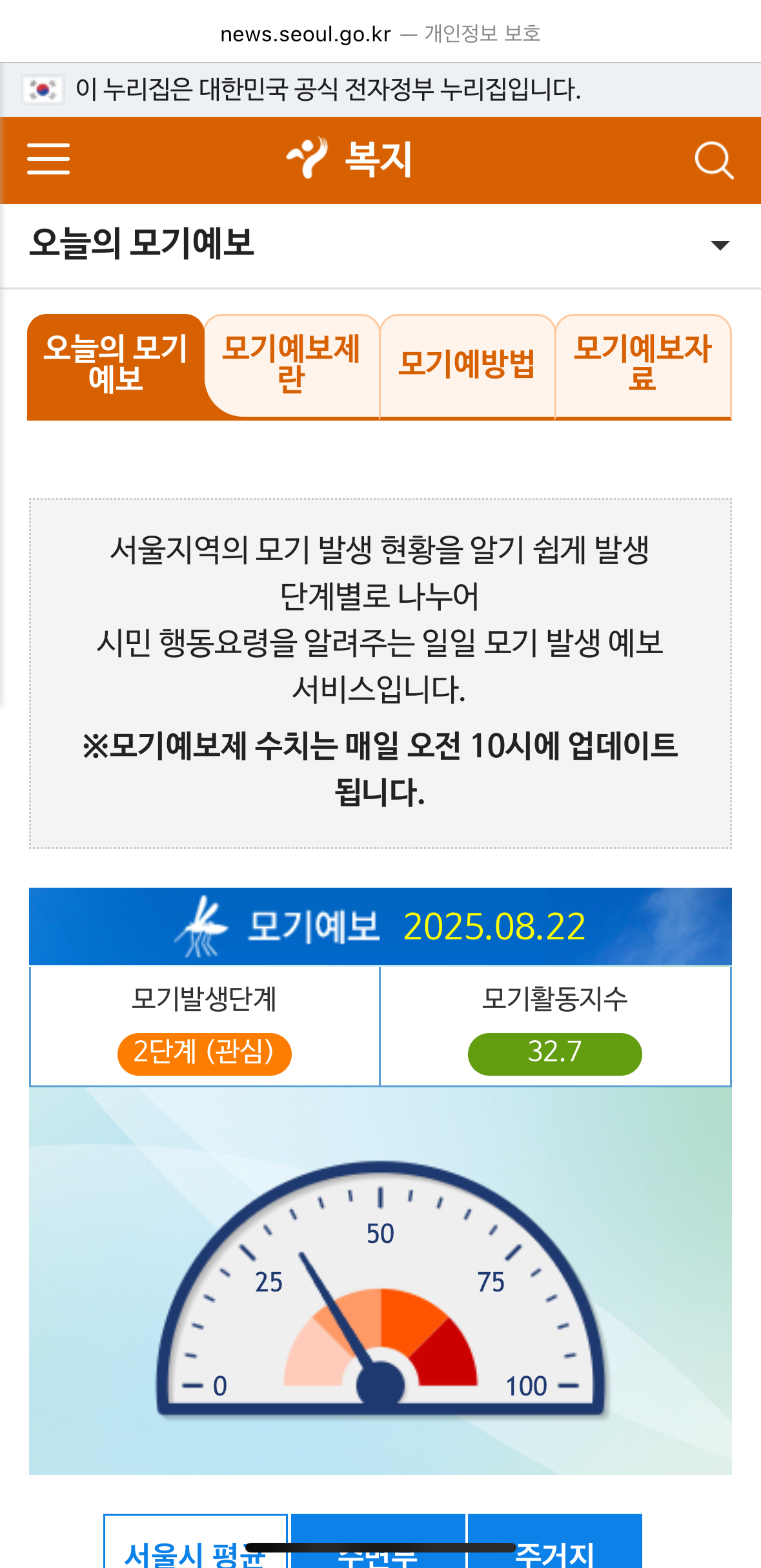 기존에는 서울시 홈페이지에서만 확인할 수 있었던 모기 예보제를 이제는 모바일 앱으로 바로 확인할 수 있습니다.
